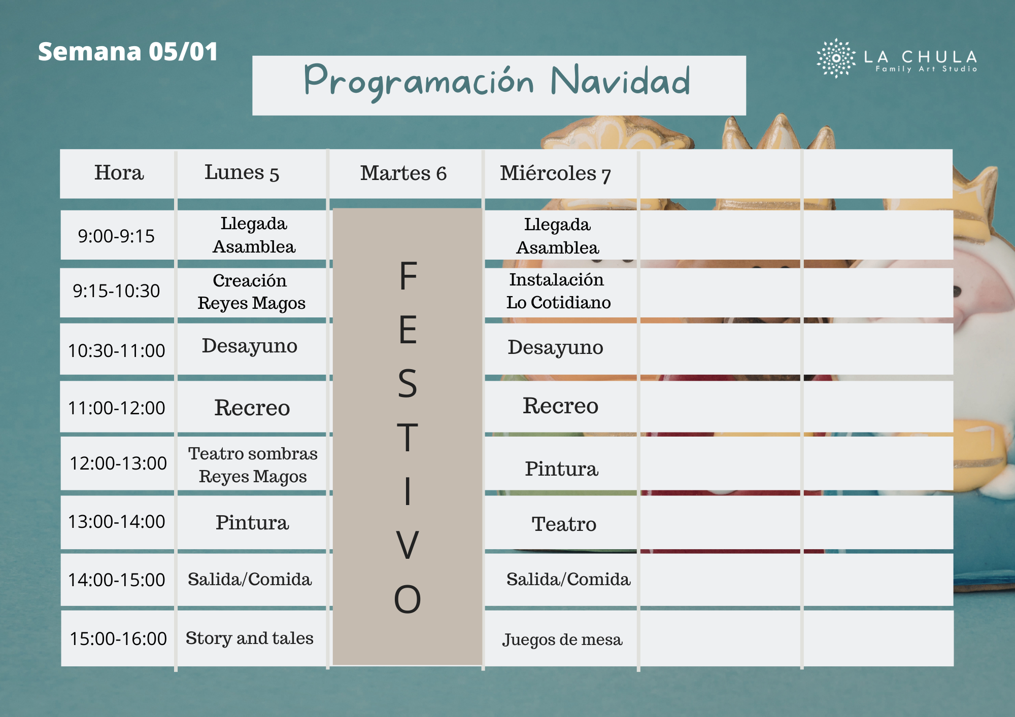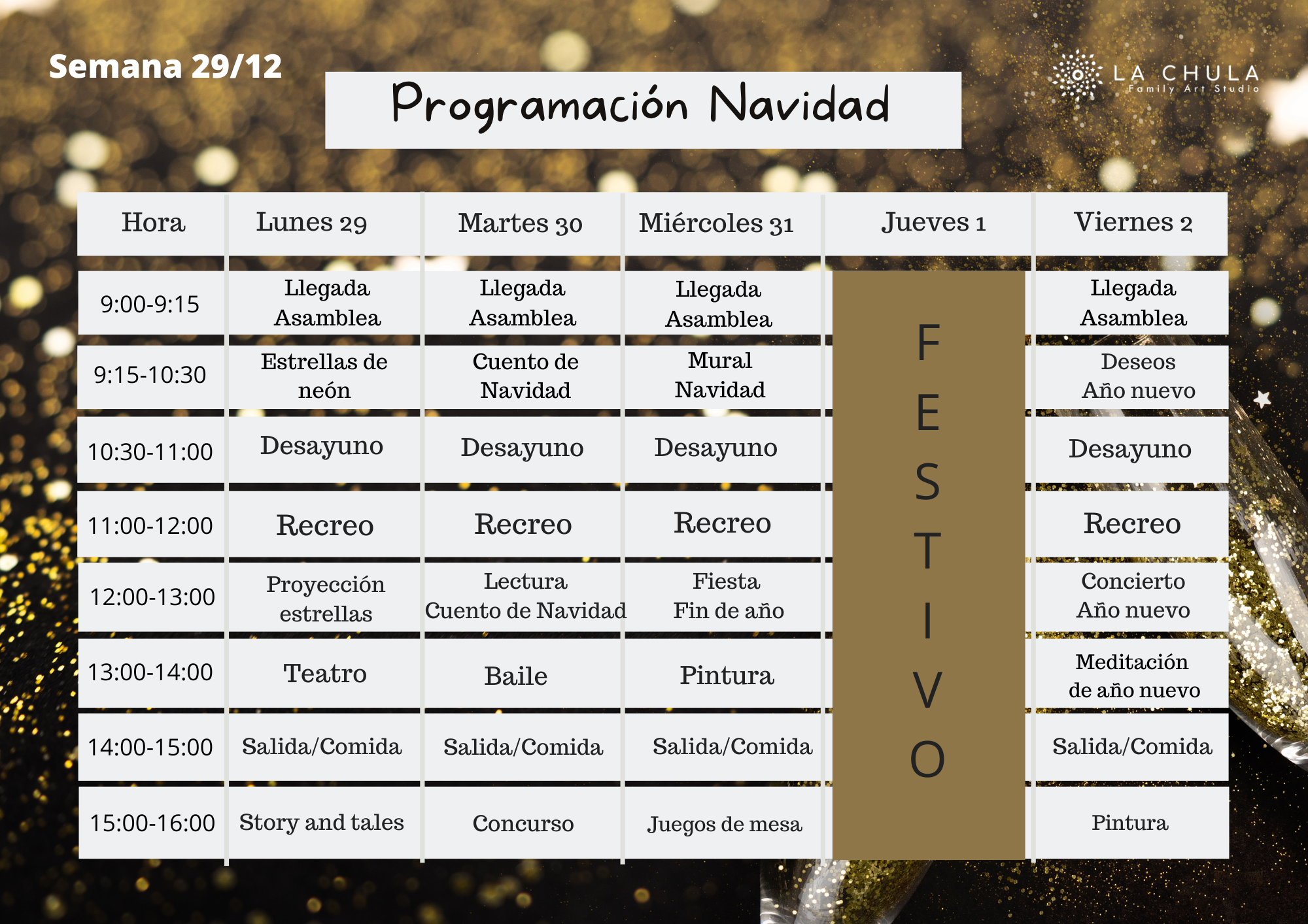 Del 22 de diciembre al 7 de Enero, 25 de diciembre,1 y 6 de enero, cerrado.